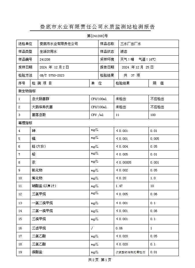 2024年12月三水廠(chǎng)出廠(chǎng)水水質(zhì)公告